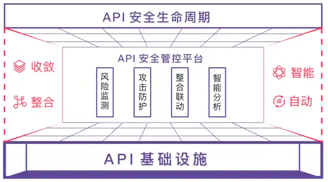 此外,由于API本身涉及到云原生通信体系在金融科技领域的各项业务,较多API可能已经在未进行安全审计的状态下,越过了设计、开发、测试阶段直接处于运行时状态。对于这一部分已经投入生产的API,最好能够建立对于API安全的管控平台。如图4所示,对已有API进行风险监测、攻击防护、联动防御和智能分析。