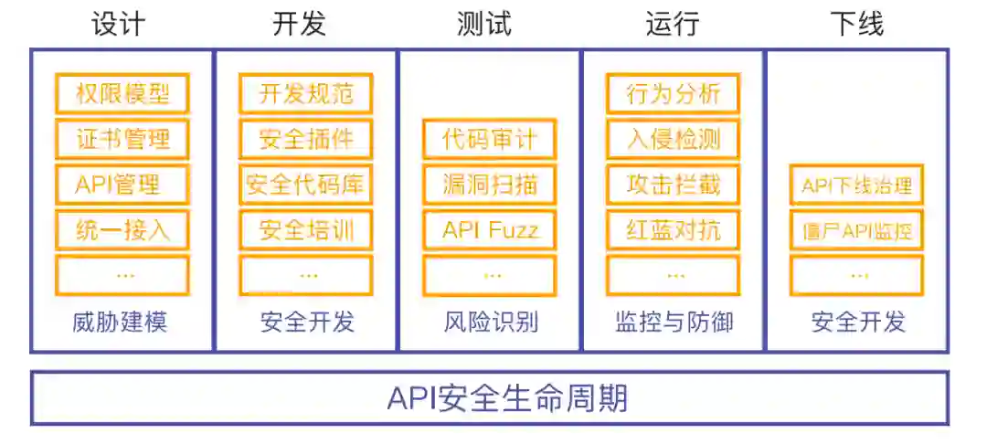 由于API的安全问题贯穿了从设计、管理到下线的全流程,因此也需要从整个API的生命周期来着手。如图3所示,表示如何在API生命周期的不同阶段落地相应的安全能力。