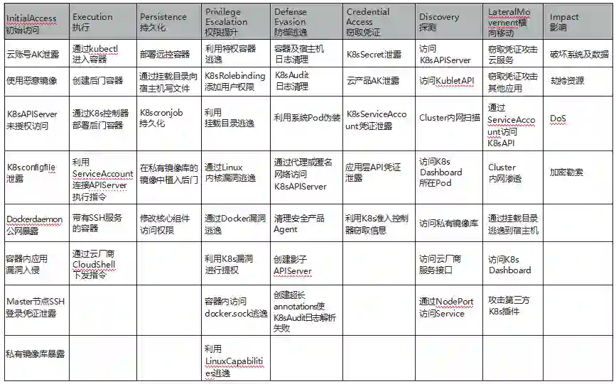 如图1所示,从攻击的角度,目前行业内已经梳理了多个针对容器的威胁矩阵。以阿里云容器ATT&CK攻防矩阵为例,攻击者在其攻击流程的初始访问、执行、持久化、权限提升、防御逃逸、窃取凭证、探测、横向移动等阶段,分别可以对于容器产生的相关攻击进行尝试。