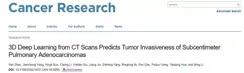 点内科技、复旦大学附属华东医院「张国桢肺微小结节诊治中心」和上海交通大学「SJTU-UCLA 机器感知与推理联合研究中心」组成的联合研究团队共同合作的科研成果「3D Deep Learning from CT Scans Predicts Tumor Invasiveness of Subcentimeter Pulmonary Adenocarcinomas」发表于美国癌症研究协会(American Association for Cancer Research,AACR)会刊《Cancer Research》期刊上,华东医院李铭教授为本篇论文的通讯作者,赵伟博士和杨健程博士为共同第一作者。