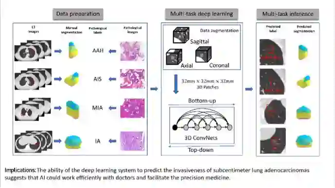 论文「3D Deep Learning from CT Scans Predicts Tumor Invasiveness of Subcentimeter Pulmonary Adenocarcinomas」于 2018 年 10 月 2 日在线发表,文章利用深度学习的方法对像素级标注的亚厘米肺腺癌 CT 数据和其病理结果标注进行训练,并通过多任务的卷积神经网络对亚厘米肺腺癌的浸润风险程度进行自动术前预测。通过建立医疗影像上的 taskonomy(任务谱),逐步使医疗影像的研究脱离西西弗斯式的悲剧(Sisyphean challenge),合理的任务配置将会极大降低模型的学习难度、迁移泛化能力、稳定性和可靠性。该模型基于 3D DenseNets,配合多任务学习,是参数高效(parameter-efficient)的 3D 卷积神经网络。训练完成后,模型只需要常规的 CT 数据,不需要肺结节分割、大小以及任何预先定义的信息。我们的多任务学习模型显著优于单任务模型,并且 3D 模型也显著优于其 2D 变种。为推进可复现的人工智能研究,基于 Keras 的模型代码开源(Apache-2.0 License)在 https://github.com/duducheng/DenseSharp。
