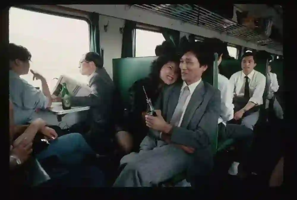 80年代,绿皮列车上一对夫妇甜蜜相依,男人西装革履手拿可口可乐,女人则烫了头穿着时髦的短裙丝袜。Peter Turnley / 视觉中国