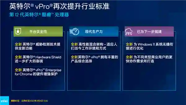 英特尔在今日凌晨正式发布了面向商务使用者的 vPro 平台,搭载 12 代酷睿处理器。英特尔表示该平台专门为生产力以及商务场景所打造,不但拥有出色的性能,同时和消费级的产品相比,vPro 平台在安全性上更加出色。并且借助 12 代酷睿处理器的性能,新一代 vPro 平台在诸多商务以及办公应用上能够提供更加出色的成绩。