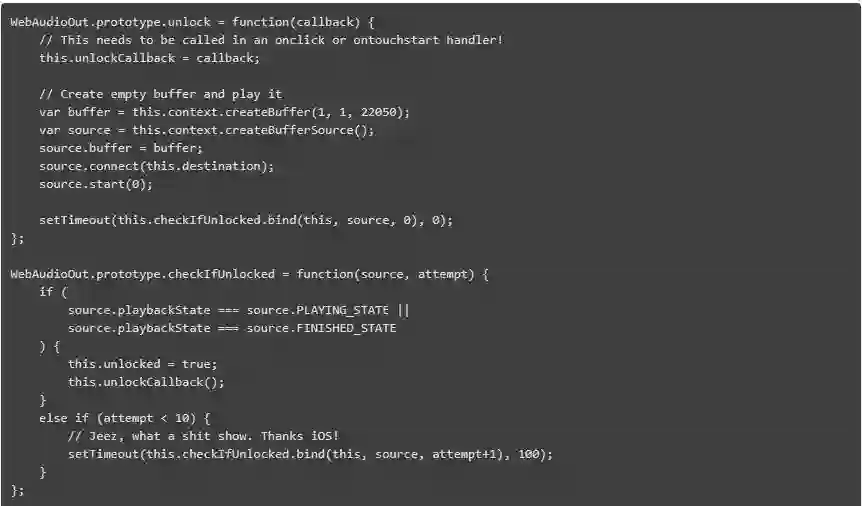 是什么让它变得糟糕透顶呢?是因为苹果公司既没有提供一种利索的解锁音频的方法,也没有提供一种方法来查询 WebAudio Context 是否已经解锁。你所要做的就是播放一个音频源并不断检查是否正在顺序播放。尽管如此,在播放之后你还不能马上检查。是的,你必须等一会!