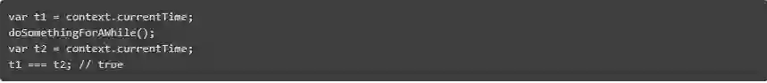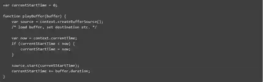 WebAudio上下文维护自己的计时器,它有别于JavaScript的Date.now()或performance.now()。 此外,你可以根据上下文的时间指导你的WebAudio源在未来的准确时间调用start()。有了这个,你可以将非常短的PCM缓冲器串在一起,而不会有任何瑕疵。