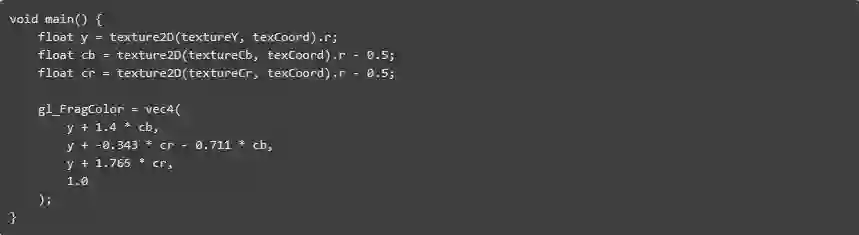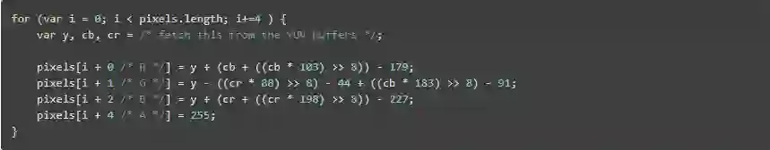 MPEG1解码器中计算密集度最高的任务之一是将MPEG内部的YUV格式(准确地说是Y'Cr'Cb)转换为RGBA,以便浏览器可以显示它。简而言之,这个转换看起来像这样: