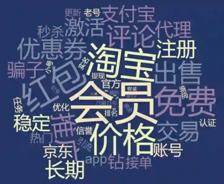 词云图的中央,是大大的两个字“会员”,各类会员,包括低价会员甚至是免费会员,深得众羊毛党的喜爱。其他福利,比如优惠券、红包、商品秒杀、激活码、各类低价QQ钻等,也有较高的词频。认领福利需要账号,账号相关的关键词,比如注册、老号、白号、小号等,也是榜上有名。既然有账号,就有连带的账号实名业务,比如认证、绑定、实名等。另外,不出意外的是,“骗子”的词频相当高,黑灰产市场本来就不受法律保护,“黑吃黑”的现象也较为普遍。