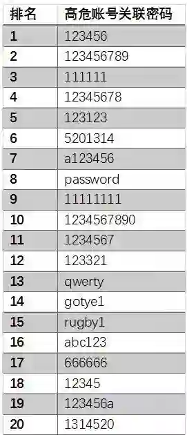 此外,猎人君也统计了与高危账号关联的密码,数量排名top 20都是一些常见的弱密码,列表如下:
