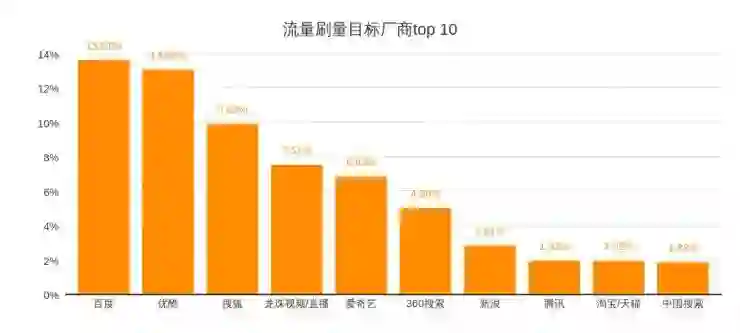 搜索引擎排名对网站的流量影响巨大。市场上有提供很多提高关键词排名的服务,原理是利用大量IP在搜索引擎搜索指定关键词,然后到指定网站,点击进入,甚至进一步模仿用户浏览、点击,欺骗搜索引擎,使其认为该站与该关键词关联度很高。百度,作为国内最大的流量出入口,榜首位置实至名归。针对百度的流量刷量类型有多种,主要类型包括刷搜索流量和点击百度网盟广告。2017年底,百度推出“惊雷算法”,旨在打击以作弊的方式提升网站搜索排序的行为,究竟效果如何,2018年我们拭目以待。Top 10榜单中还出现了360搜索和中国搜索,刷搜索流量在整个流量刷量产业中的比重可见一斑。
