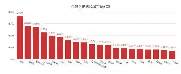 以下两张图片为全球黑IP来源城市top 20和全球黑IP所属运营商top 10。从来源城市数据看来,top榜单中大多数是美国城市,中国城市数量紧随其后,其中北京更是占据了榜首。上榜的城市都是经济较为发达的城市。从所属运营商数据看来,top 10中一半是美国的运营商。
