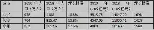 截至2018年,三个城市GDP都过千万,武汉、郑州的人口也都突破千万,唯一例外是长沙以刚过八百万的人口,实现了11000亿的GDP。