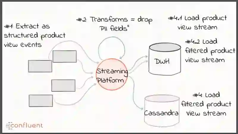 Kafka 能够通过 Kafka Connect API 实现流数据管道的构建,也就是 ETL 中的 E 和 L。Connect API 利用了 Kafka 的可扩展性,基于 Kafka 的容错模型进行构建并且提供了一种统一的方式监控所有的连接器。流处理和转换可以通过 Kafka Streams API 来实现,这提供了 ETL 中的 T。使用 Kafka 作为流处理平台能够消除为每个目标 sink、数据存储或系统创建定制化(很可能是重复的)抽取、转换和加载组件的需求。来自 source 的数据经过抽取后可以作为结构化的事件放到平台中,然后可以通过流处理进行任意的转换。