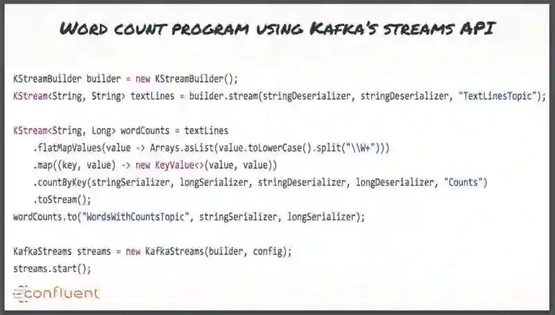 Kafka Streams API 提供了一个便利的 fluent DSL,具有像 join、map、filter 和 window 这样的操作符。