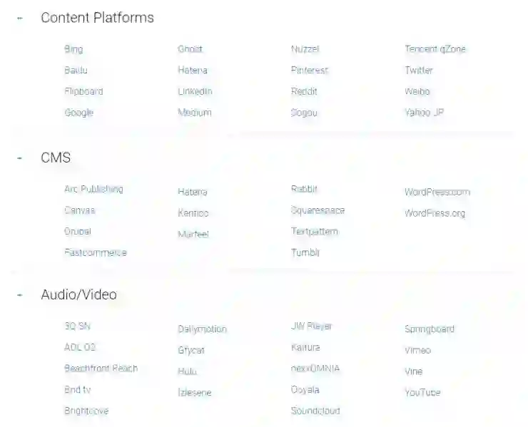 Google 除了建立一个专门的团队来进行 AMP 的相关开发任务之外,还与来自全球的广告商、内容提供商、CMS(内容管理系统)、Audio/Video 厂商达成了合作协议。以其中的内容提供商和 Audio/Video 厂商为例,支持 AMP 的包括 Google、百度、Bing、微博、搜狗、腾讯 QQ 空间、Medium、LinkedIn、雅虎日本、YouTube、Hulu 等,可以说是全球内容圈的半壁江山了。