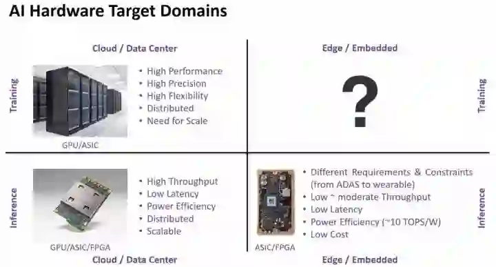 从功能来看,可以分成Training和Inference;而从应用场景则可以分成“ Cloud / Data Center”和“Edge / Embedded”两大类。其中在Edge端做training目前还不是很明确的需求,暂时不去考虑。其它几个象限都有自身实现的需求和约束。为了适应AI应用的需求,大家对于AI硬件做了大量的探索,具体可以参考下面两篇文章: