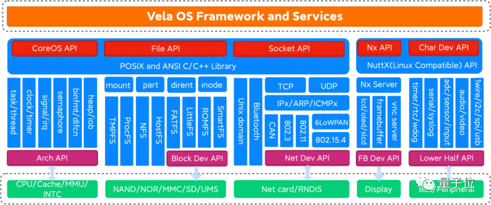 小米Vela主要分为三⼤部分:底层是NuttX内核、上层是Vela应⽤框架,⽽右侧是开发者⼯具。小米Vela的初衷是提供丰富的组件和易⽤的框架,把开发者解放出来。