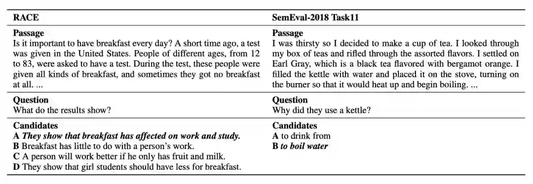 SemEval-2018 Task11 是 NAACL 下的一个阅读理解评测任务,与 RACE 最大区别是选项个数为二,另外 SemEval-2018 Task11 上的问题相对较简单。