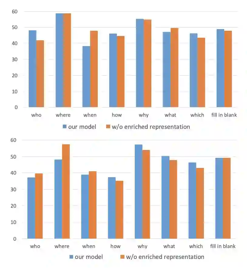 这部分主要是分析我们在 RACE 数据上不同类型的问题上的效果,对比的是不包含使用 Attention 丰富表示的模型,从图中(左图开发集,右图测试集)我们可以看出无论是在开发集还是在测试集上,我们的模型在 why 和 how 这两类问题上都是要明显高于参照系统,说明我们的系统在这类需要推理的问题上有着明显的优势。