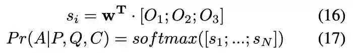 通过这个部分可以抽取到匹配特征(O1,O2,O3),后续我们将这些特征链接在一起输入到全连接神经网络,最终得到每个选项作为答案的概率。具体公式如图。