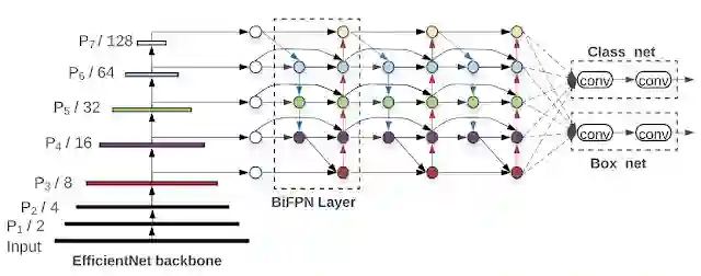 EfficientDet 架构。EfficientDet 使用EfficientNet作为骨干网络,并结合使用了最新提出的BiFPN特征网络。