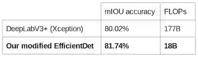虽然EfficientDet 模型主要是为目标检测而设计的,但谷歌研究者也检验了它们在其他任务(如语义分割)上的性能。为了执行分割任务,他们稍微修改了EfficientDet-D4,将检测头和检测的损失函数替换为分割头和分割的损失函数,同时保留了相同大小的骨干网络和BiFPN。