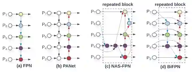 另一个优化是提高特征网络的效率。虽然以往的检测器大多采用自上而下的特征金字塔网络(FPN),但他们发现自上而下的FPN本质上受到单向信息流的限制。可替代FPN的网络 ,比如PANet,添加了一个额外的自下而上的流,往往要以增加计算量为代价。