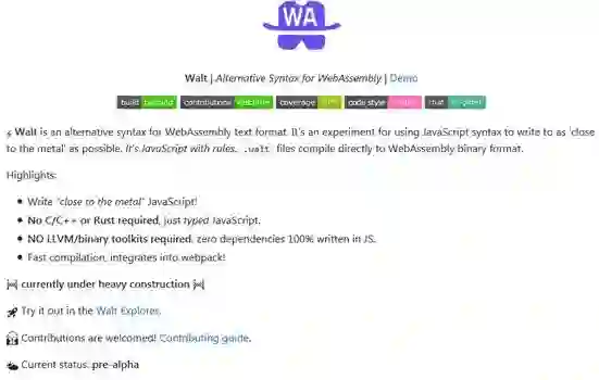 目前,在多数网页开发者尚未熟悉使用 Asm.js,WebAssembly 技术的情况下,有一款叫做 Walt 的工具或许可以帮助到他们,目的是让网页开发者可以不用接触 C、C++ 或者 Rust 语言,继续使用 JavaScript 语法,来打造出接近机器码效率的网页应用。此外 Walt 也不需要依靠 LLVM 编译器或者其他二进制转换工具,可以直接将源代码编译成 WebAssembly 格式。