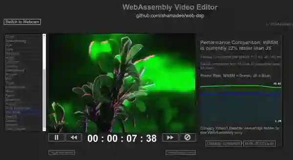 该工具开发者也展示了使用 WebAssembly 的图像编辑器,在播放视频的同时,使用者也可以即时选择套用各项效果,如负片、灰阶、噪点、锐化等处理。