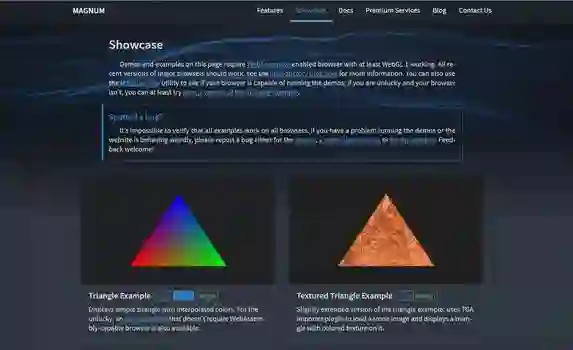 Magnum 是一款轻量级和模块化的游戏、数据可视化 OpenGL 图形处理引擎,支持 C++11/C++14。桌面环境一共支持 Linux、Windows 及 Mac,移动环境也支持了 iOS 和 Android,并且整合了嵌入式 Linux,而在网页环境则必须通过编译器 Emscripten 将代码编译成 Asm.js、WebAssembly 格式。该工具所支持的图片 API,包含了 OpenGL、OpenGL ES 及 WebGL。