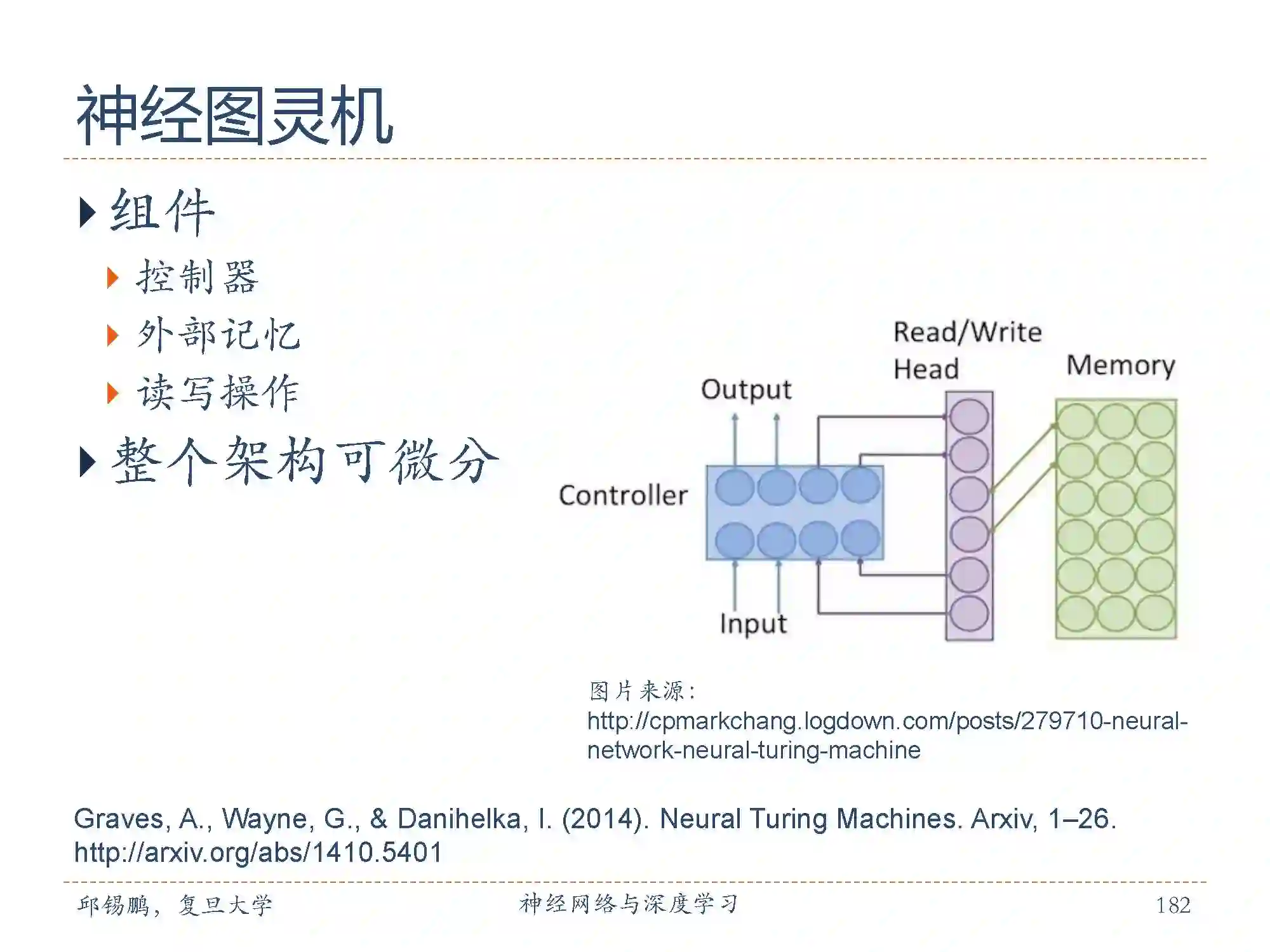 神经图灵机(NeuralTuring Machine,NTM)[Graves et al., 2014]主要由两个部件构成:控制器和外部记忆。