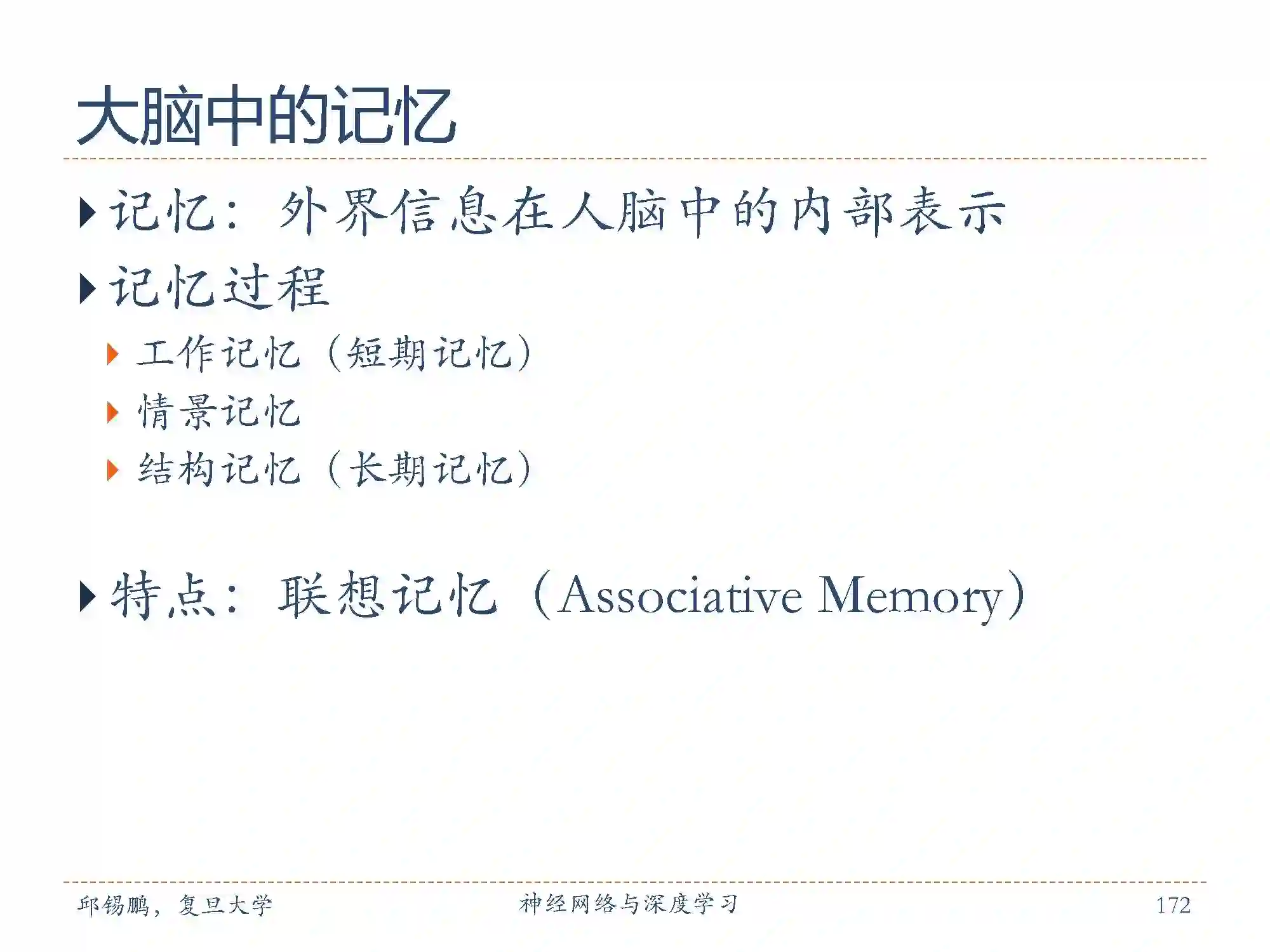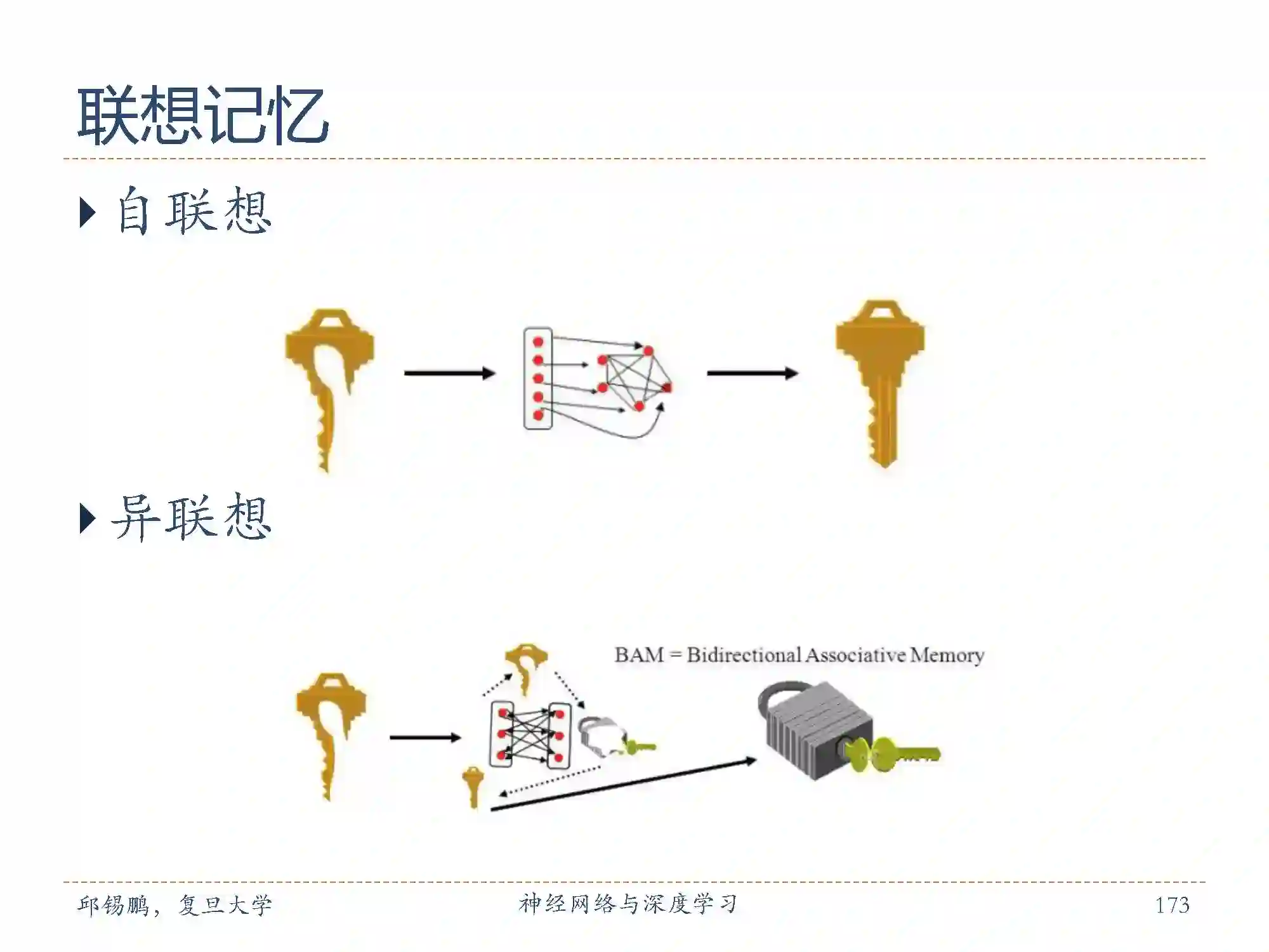 联想记忆:大脑记忆的一个主要特点是通过联想来进行检索的。 联想记忆(associative memory)是指一种学习和记住不同对象之间关系的能力,比如看见一个人然后想起他的名字,或记住某种食物的味道等。