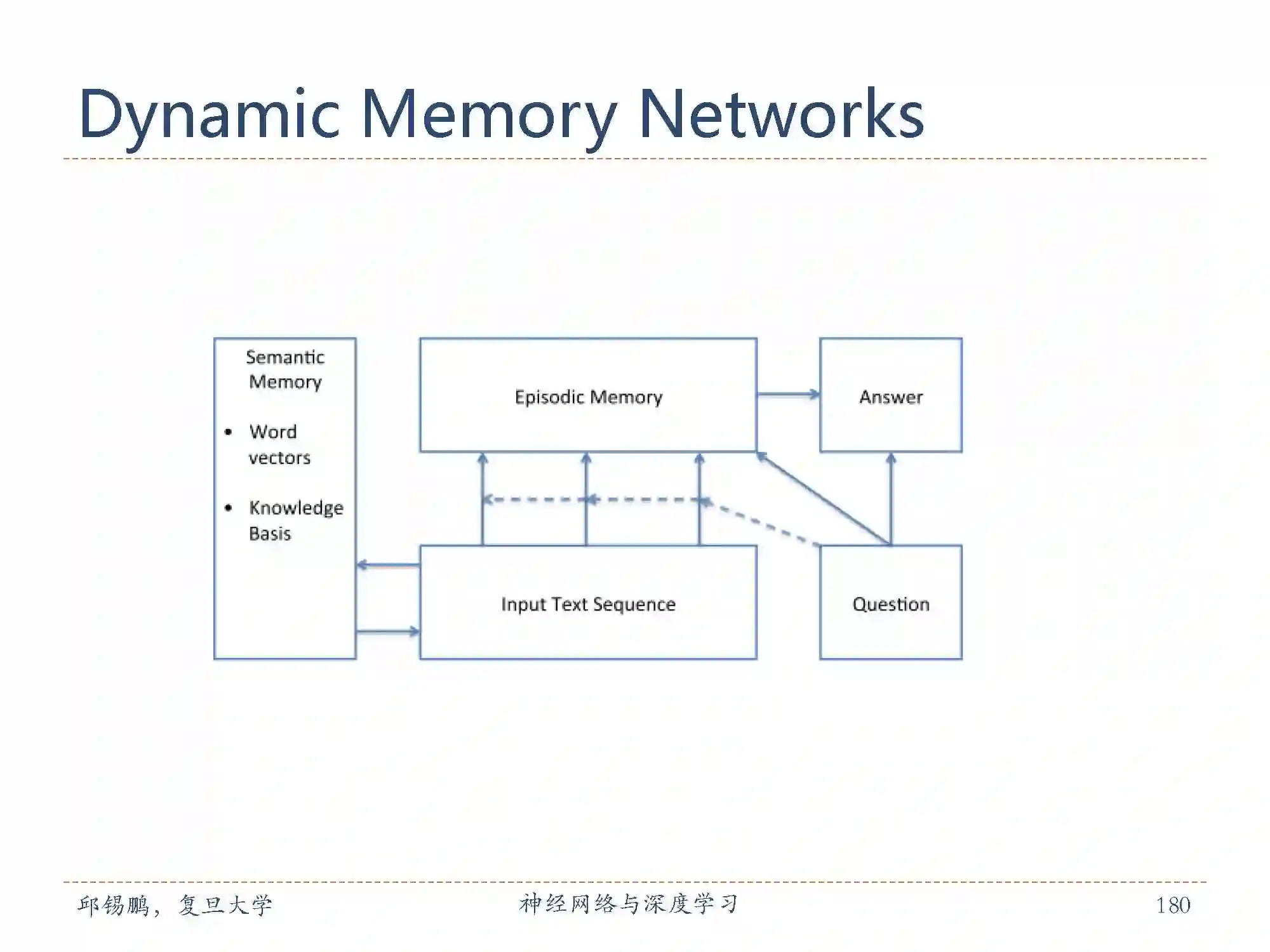 动态记忆网络[Kumar et al., 2015]也是引入了外部记忆的模型。主要包括输入模块,问题模块片段记忆模块,回答模块。动态记忆网络可进行端到端的训练,并在多种任务上取得了 state-of-the-art 的效果包括 QA(Facebook 的 bAbI 数据集),情感分析文本分类(Stanford Sentiment Treebank)和词性标注(WSJ-PTB).