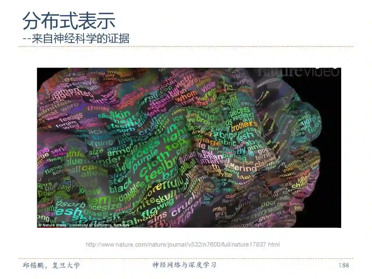 来自认知科学的研究成果,利用分布式表示绘 制词汇大脑地图。词汇们分布在大脑四周,没有绝对的语言区域;意义相关的词语所激活的大脑区域相似;与词义对应的大脑区域呈双脑对称,这与过去一直以为的「左脑负责语义」的认识相悖;这份大脑词汇地图在人与人之间一致性很高