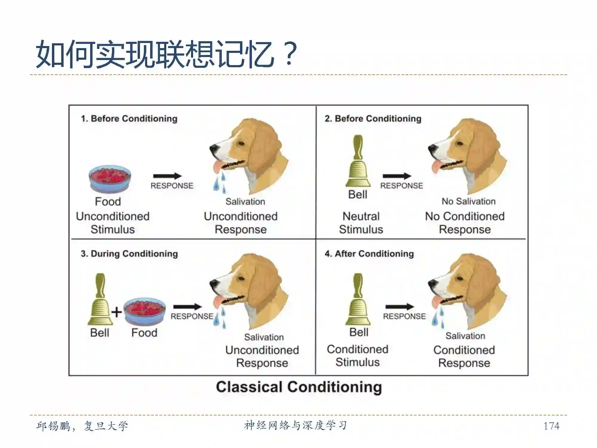 通过联想记忆训练狗的进食与铃声的实验,比如狗在看到食物的时候会生津,在听到铃声的时候不会生津,通过在狗进食前进行铃声训练,久而久之,狗在下次听到铃声的时候就会生津。这是一种联想记忆的训练方法。