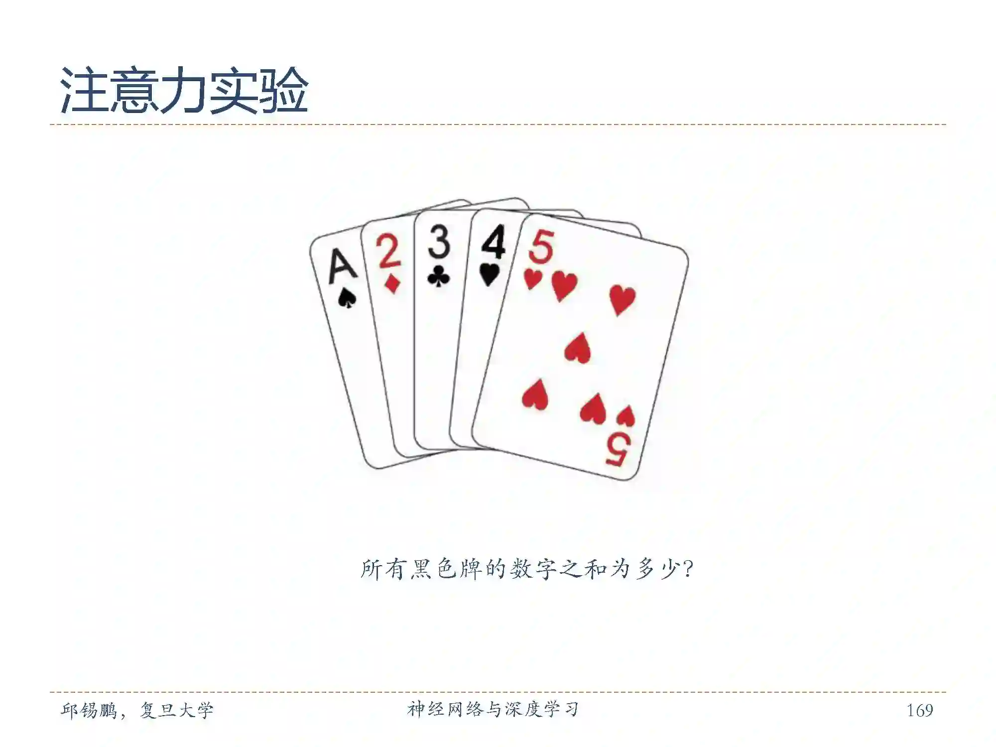 邱老师也列举了一个经典的注意力实验,通过计算所有黑色牌数字的和进行注意力实验。我们在统计黑色牌数字和的时候,只需要专注牌的颜色和数字大小即可。
