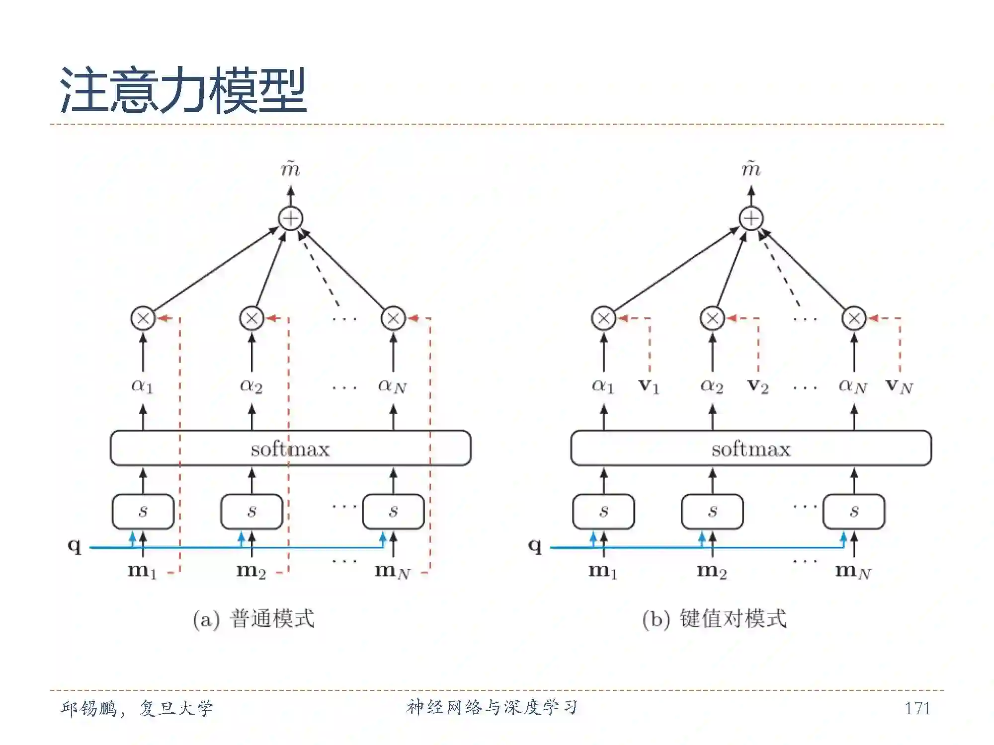 是机器学习的一个子问题。神经网络的注意力模式常见的注意力模式有普通模式和变体模式:普通模式:我们用m1:N =[m1, · · · , mN]表示N 个输入信息。在特定的上下文q时,为了节省计算资源,不需要将所有的 N 个输入信息都输入到神经网络进行计算,只需要从 m1, · · · , mN 中选择一个相关的信息输入给神经网络。我们用来表示注意力变量z ∈[1, N]来表示被选择信息的索引,即 z = i表示选择了第 i个输入信息。然后通过一个注意力打分函数获取注意力分布。键值对注意力用键值对(Key-Value Pair)格式来表示输入信息,其中“键”用来计算注意力分布 αi,“值”用来生成选择的信息。我们用(k, v)1:N = [(k1, v1), · · · , (kN , vN)]表示N 个输入信息。在特定的上下文 q 时,注意力函数为下面公式,在键值对模式中 ∀i, ki = vi,则就等价于普通模式。