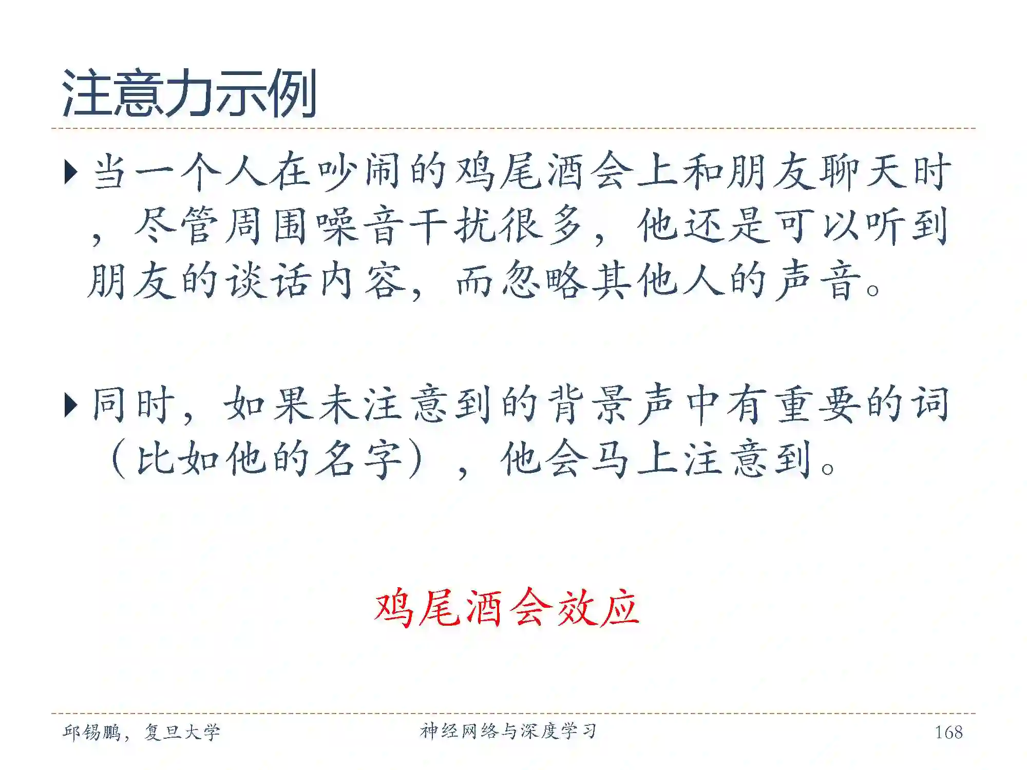 在心理学中,有一种“鸡尾酒会效应”:当一个人在吵闹的鸡尾酒会上和朋友聊天时,尽管周围噪音干扰很多,他还是可以听到朋友的谈话内容,而忽略其他人的声音。同时,如果未注意到的背景声中有重要的词(比如他的名字),他会马上注意到。