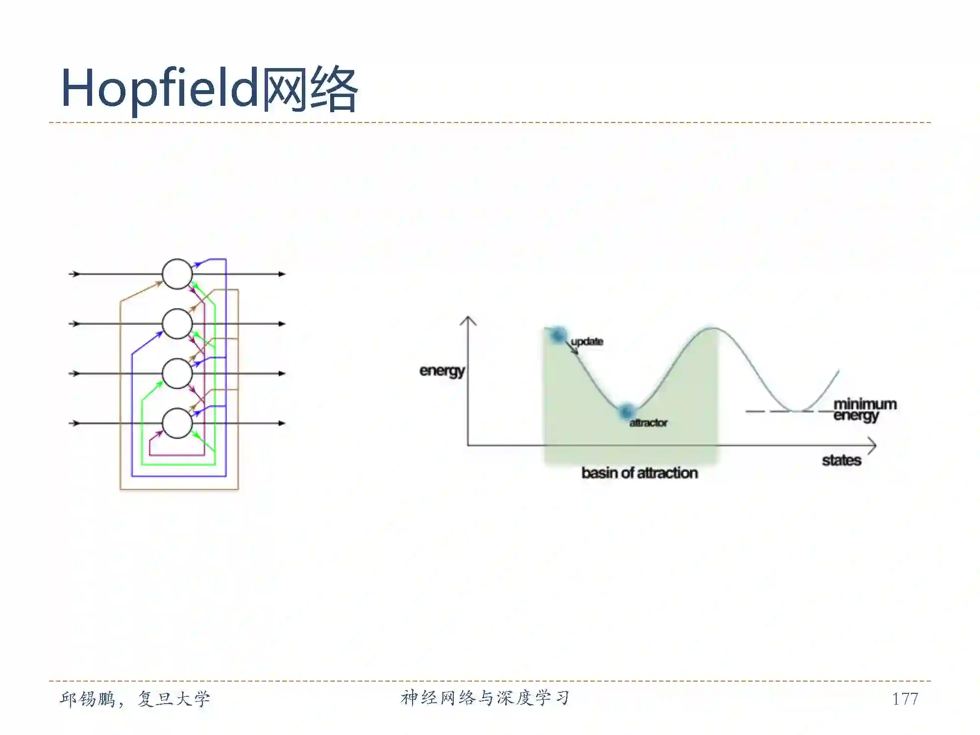 Hopfield网络(Hopfieldnetwork)是一种循环神经网络模型。有一些重要的特征,首先权重对称的要求是一个重要特征,因为它保证了能量方程(称向函数某一点收敛的过程为势能转化为能量)在神经元激活时单调递减,而不对称的权重可能导致周期性的递增或者噪声。然而,Hopfiled 网络也证明噪声过程会被局限在很小的范围,并且并不影响网络的最终性能。
