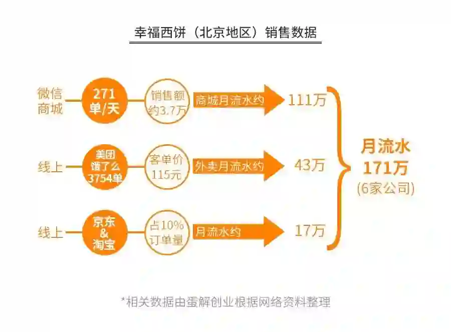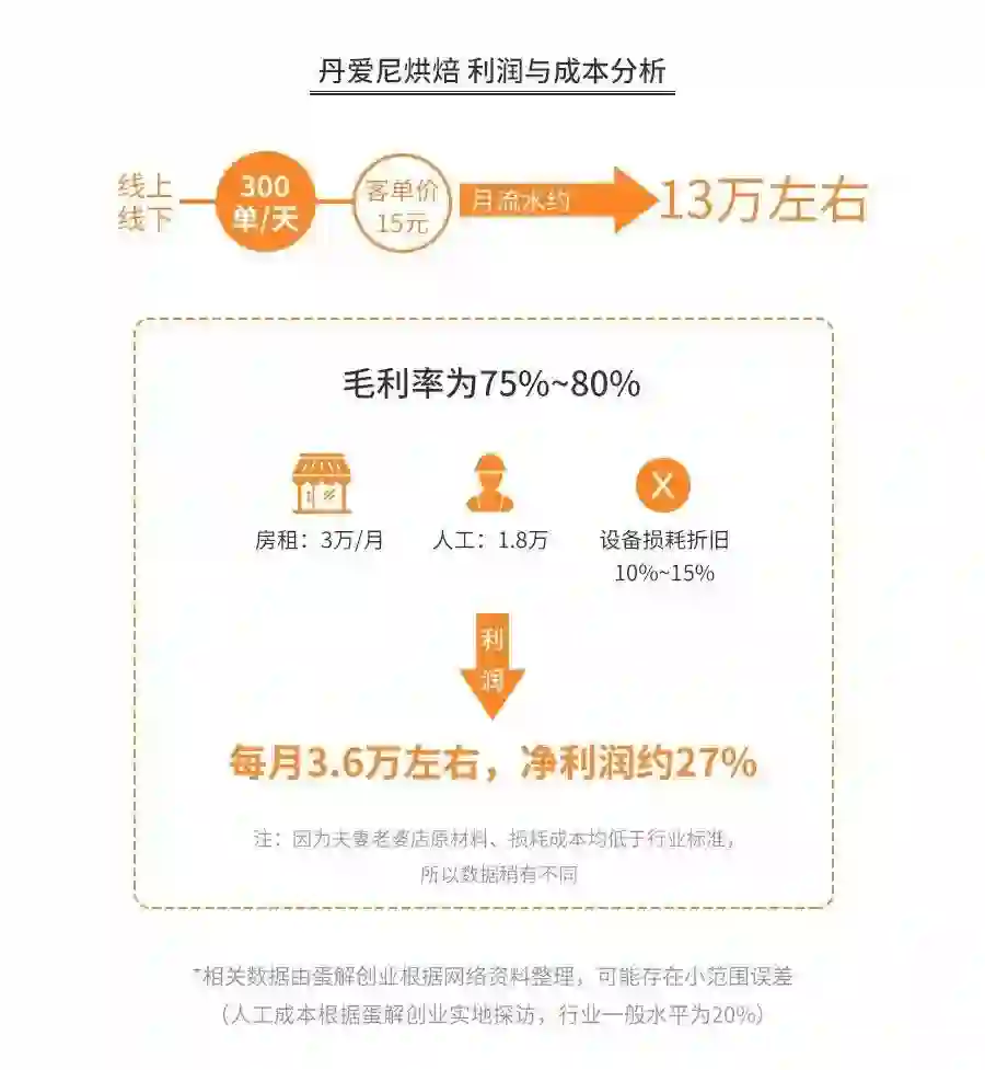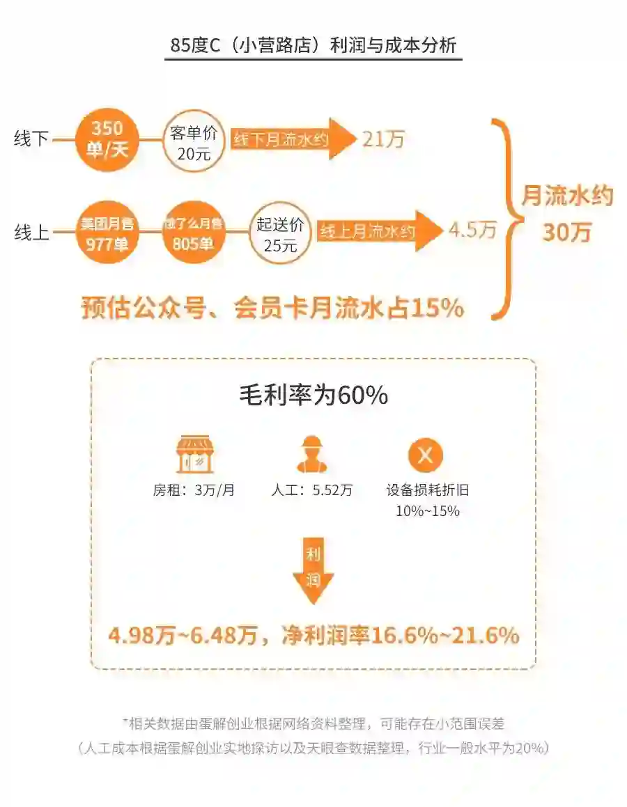 蛋解创业探访的北京小营路店,综合判断这家店单日卖350单。用大众点评上的客单价20元来计算,这家店线下月流水约21万。美团外卖显示月售977单,饿了么805单,起送25元,无满减,线上月流水4.5万。加起来月流水25.5万。实际上还有通过公众号订蛋糕、卖会员卡未统计到,按15%计,所以实际月流水我们按照30万来计算。