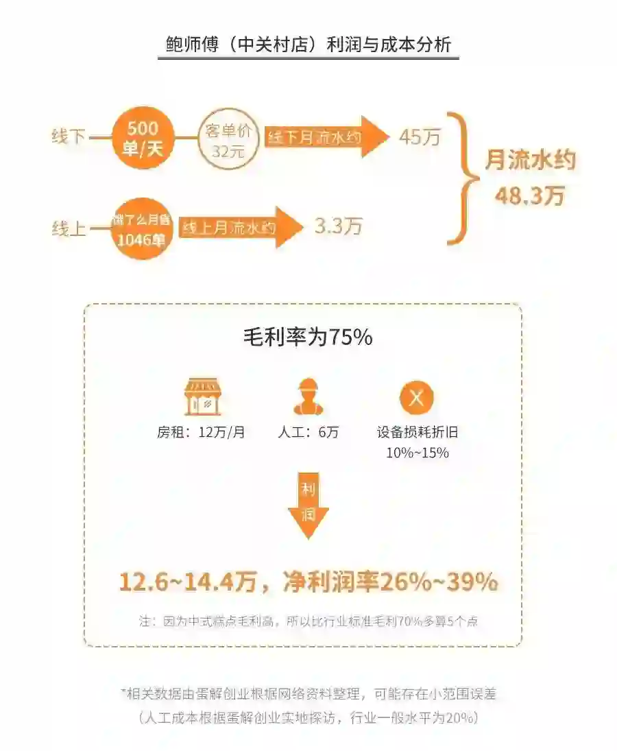 根据蛋解创业在店15分钟,看到中关村店有16人在排队的情况来判断,该店应该是长期排队,一天大概500单左右(预估),另外根据饿了么月售数据显示,中关村外卖月售1046单。鲍师傅客单价是32元,那这家店月流水在48.3万左右。
