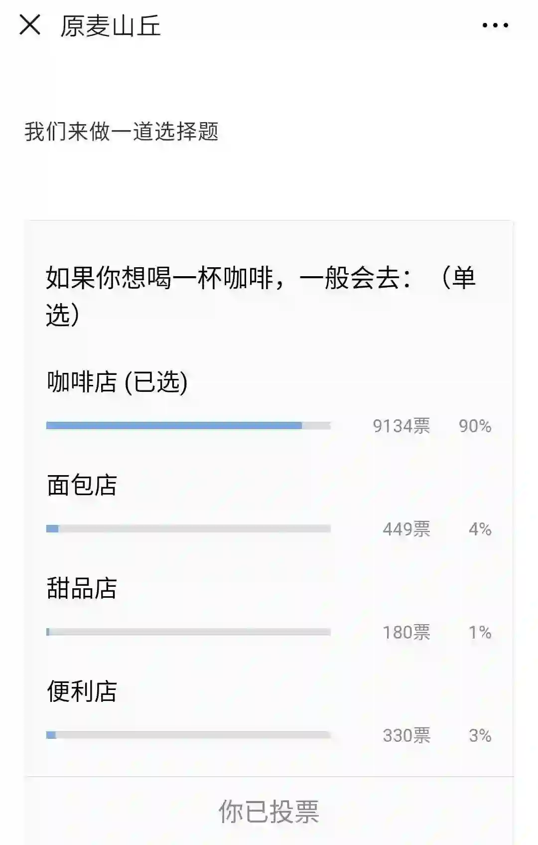 从蛋解创业的探店情况来看,原麦山丘也卖咖啡和茶,但实际买咖啡和茶的人不足买面包的十分之一。在美团外卖上,甚至看不到饮品。最近他们公号做了一次关于饮品的投票,结果有些尴尬。