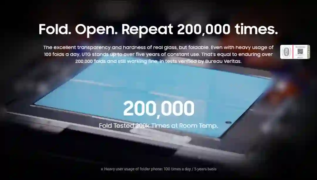 三星显示近日在英文版官网展示了下一代柔性 OLED 屏的信息,这款屏幕表面覆盖 UTG 超薄玻璃,据官方介绍,Bureau Veritas 对屏幕进行了折叠测试,结果表明产品支持室温下 20 万次弯折而不损坏,这意味着每天折叠 100 次,可以连续使用 5 年。
