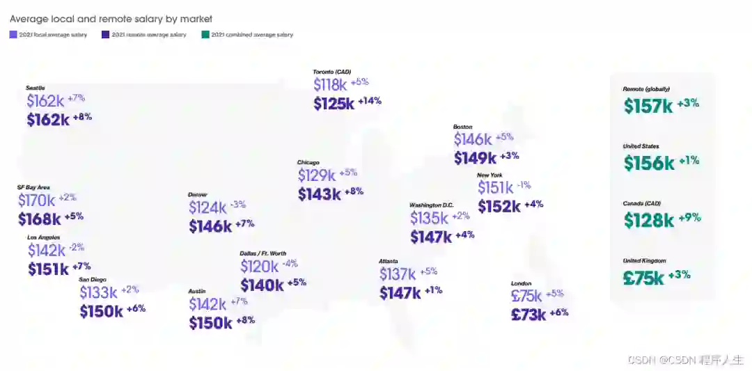 招聘全球化,所有市场的远程工资都在增加,随着软件工程师有更多机会为全球的公司工作,加拿大和英国正在追赶美国,提供更具竞争力的薪酬。在城市层面,与大型科技中心相比,较小地区也有较高的薪酬增长。