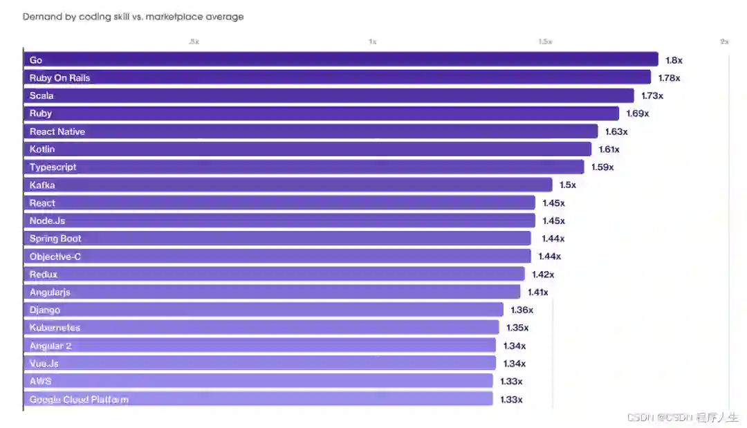 可以看出,拥有Go技能的软件工程师最受雇主欢迎,他们收到的面试请求是市场平均水平的1.8倍。