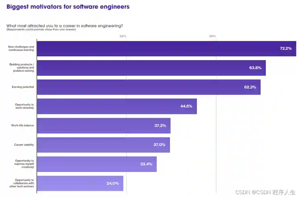 Hired调查了受访者们从事软件工程的理由(答案多选),结果显示,他们最大的动力来自于新的挑战和持续的学习。其次建设产品/解决方案和问题解决、赚钱的潜力这两个原因得票率也很高。