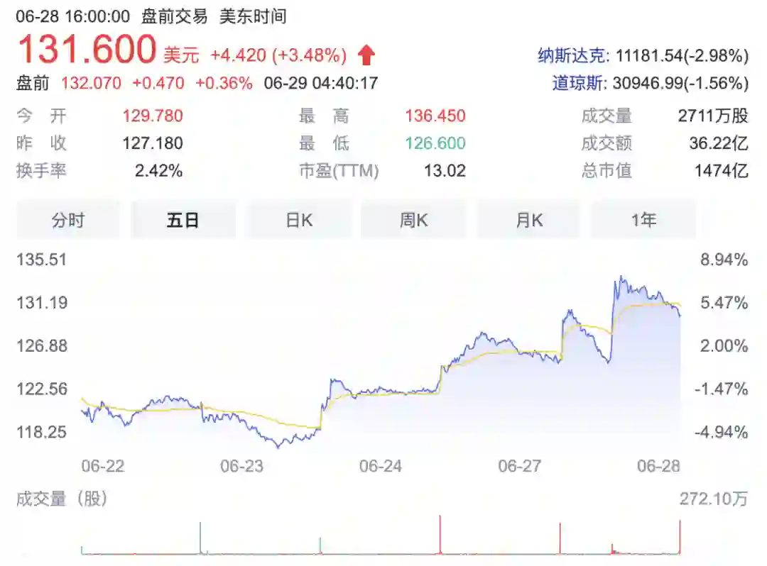 从20%到100%,高通股价拉升,上涨3.48%,而苹果股价下跌2.98%。