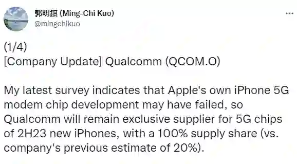 天风国际分析师郭明錤,本周二在推特上发文称,苹果自研 iPhone 5G 芯片研发可能已经失败,高通成为了2023年iPhone的唯一5G基带芯片供应商。