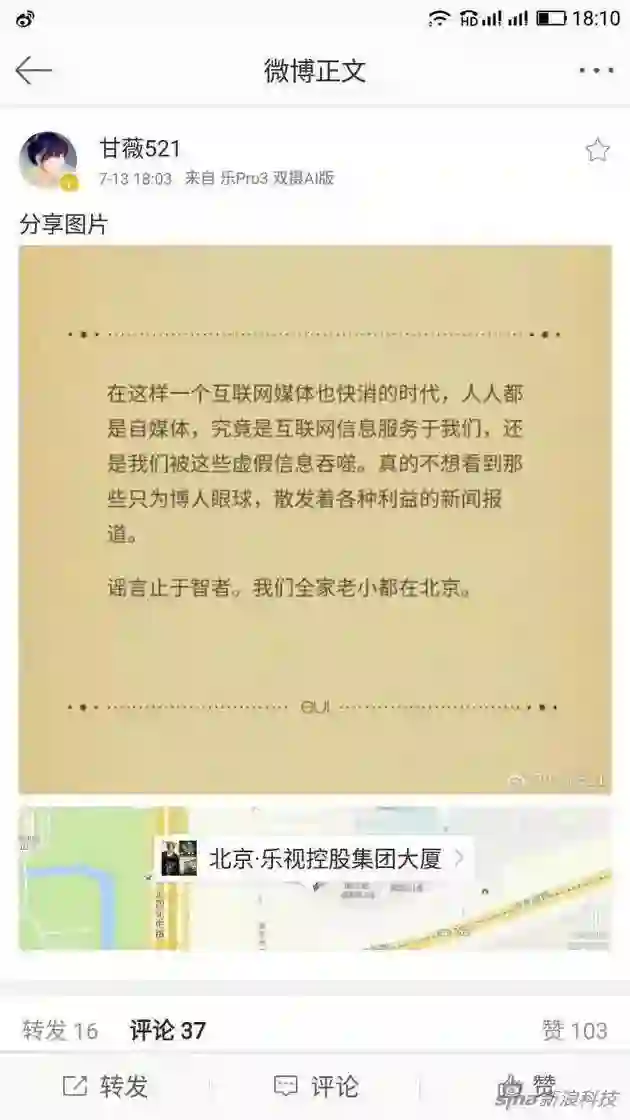 贾跃亭妻子甘薇定位乐视大厦发博:全家老小都在北京