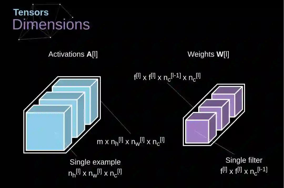 输出张量的尺寸(可以称为3D矩阵)满足以下等式,其中:n - 图像大小,f - 滤波器大小,nc - 图像中的通道数,p - 填充大小,s - 步幅大小,nf - kernel 的数量。
