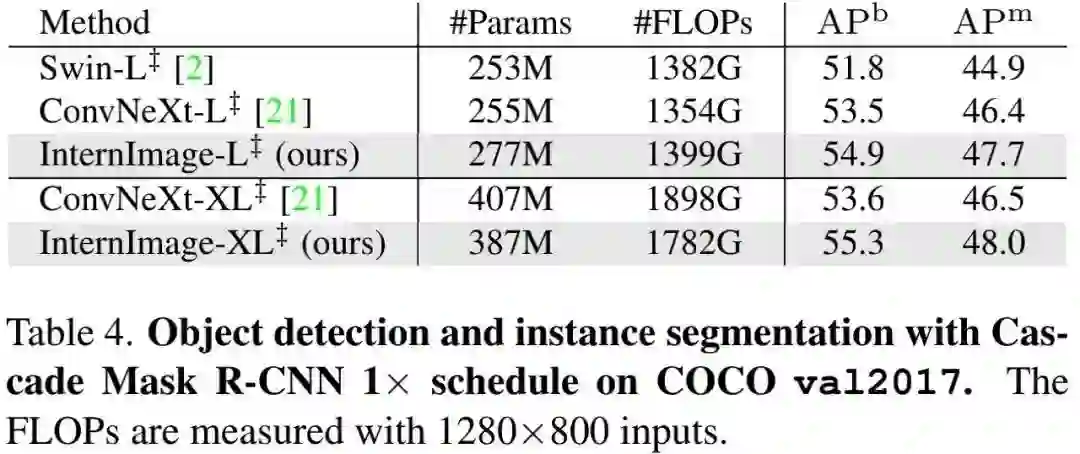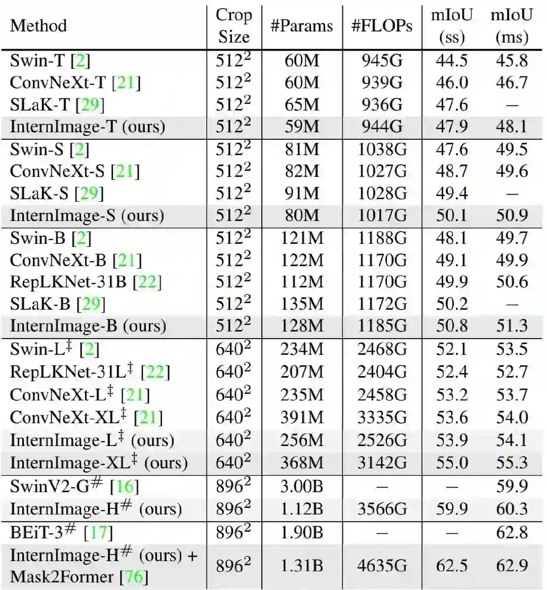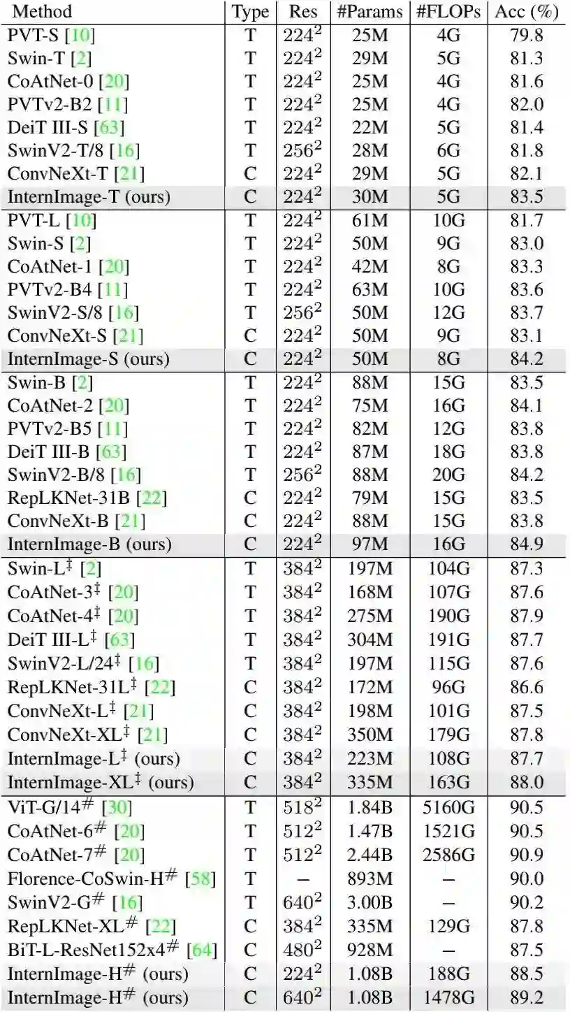 其中, 。通过实验, 作者发现最佳缩放配置为详见下表。为进一步探索模型容量, 作者还构建了具有 参数量的InternImage-H.